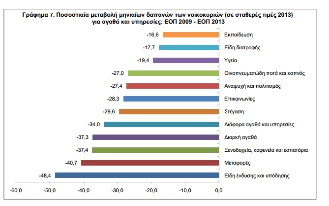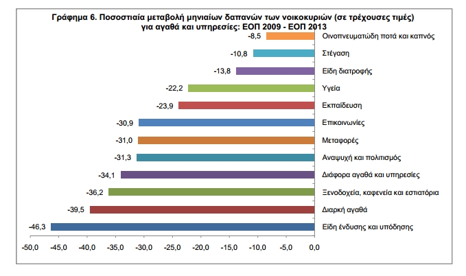 Σε σχέση με την έρευνα του 2012, καταγράφεται μεγαλύτερη μείωση δαπανών, σε τρέχουσες τιμές, για διαρκή αγαθά (-11,6%), εκπαίδευση (-11,3%), μεταφορές (-9,9%), διάφορα αγαθά και υπηρεσίες (-9,5%), ξενοδοχεία, καφενεία και εστιατόρια (-9,3%), επικοινωνίες (-9,2%), στέγαση (-8,8%), ένδυση-υπόδηση (-8,3%).