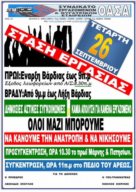 Το Συνδικάτο των εργαζομένων στον ΟΑΣΑ κήρυξε στάση εργασίας την Τετάρτη 26 Σεπτεμβρίου.