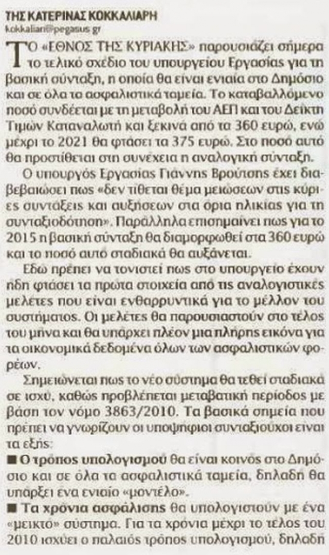 Το «Εθνος της Κυριακής» παρουσιάζει σήμερα το τελικό σχέδιο του υπουργείου Εργασίας για τη βασική σύνταξη, η οποία θα είναι ενιαία στο Δημόσιο και σε όλα τα ασφαλιστικά ταμεία.