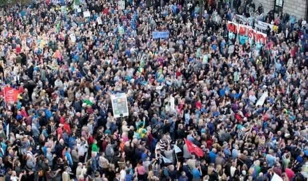 Το Σάββατο 11 Οκτωβρίου στους δρόμους του Δουβλίνου συγκεντρώθηκαν 100.000 Ιρλανδοί οι οποίοι διαδήλωσαν κατά των επικείμενων αυξήσεων στο νερό.