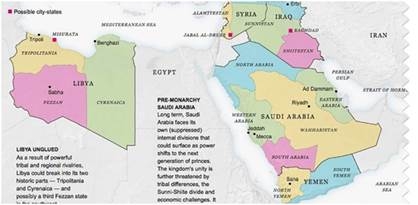 ΠΓ: Για να διευκολύνουμε στη κατανόηση του παρόντος άρθρου, έχουμε προσθέσει δυό αποκόμματα από τον χάρτη. Στη πρώτη εικόνα φαίνεται ο διαμελισμός των κρατών της Εγγύς και Μέσης Ανατολής καθώς και της Λιβύης (η οποία διαμελίζεται σε τρία κράτη).