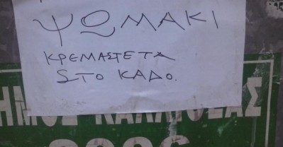 ''Παρακαλούμε φαγώσιμα και ψωμάκι, κρεμάστε τα στον κάδο'', γράφει το χαρτί, σ' έναν κάδο στην Καλλιθέα.