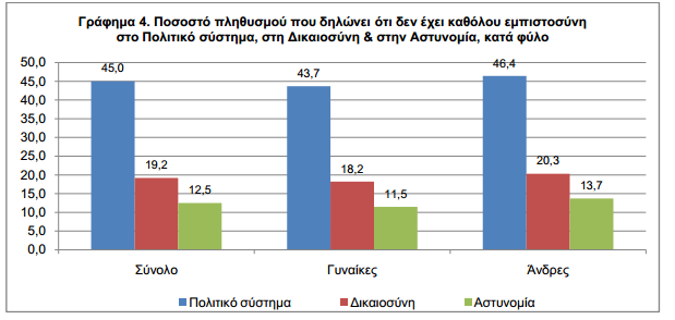 Το 45,0% του συνολικού πληθυσμού δηλώνει ότι δεν εμπιστεύεται καθόλου το πολιτικό σύστημα, ενώ 19.2% και 12,5% δηλώνει ότι δεν εμπιστεύεται καθόλου τη Δικαιοσύνη και την Αστυνομία αντίστοιχα. Τα ποσοστά αυτά είναι μεγαλύτερα για τους άνδρες (46,4%, 20,3% και 13,7% αντίστοιχα) σε σχέση με τις γυναίκες (43,7%, 18,2% και 11,5% αντίστοιχα), καθώς και για τον πληθυσμό (47,4% 22,8% και 15,3% αντίστοιχα), σε σχέση με τον μη φτωχό πληθυσμό (44,3%,18,2% και 11,8% αντίστοιχα). Πλήρως, δηλώνει, ότι εμπιστεύεται το πολιτικό σύστημα μόλις το 0,6% του συνολικού πληθυσμού, χωρίς να υπάρχει διαφοροποίηση μεταξύ ανδρών και γυναικών.
