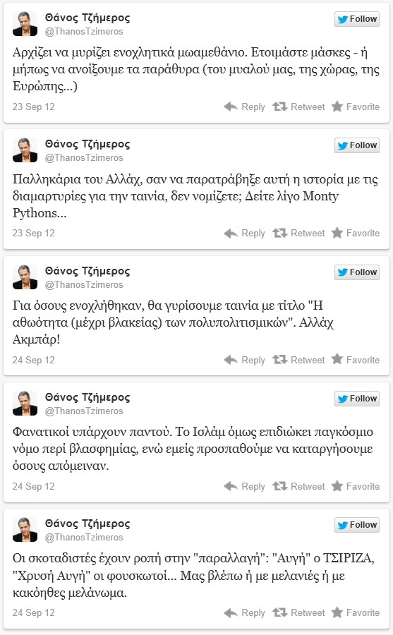 Οι αντιδράσεις των μουσουλμάνων για την ταινία και τα σατιρικά σκίτσα σχετικά με τον προφήτη τους πυροδότησε την αντίδραση του Θάνου Τζήμερου ο οποίος γράφει: