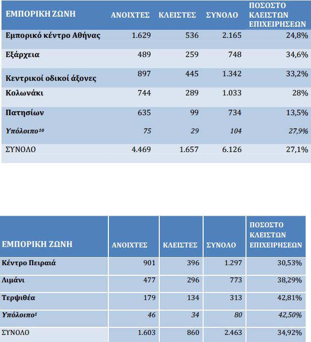 Αναλυτικότερα στην Αθήνα η τελευταία καταγραφή συγκεντρώνει ποσοστό κλειστών καταστημάτων της τάξεως του 27%, ενώ σε σύγκριση με τον προηγούμενο χρόνο παρουσιάζεται αισθητή μείωση, της τάξεως των 6 ποσοστιαίων μονάδων. Το γεγονός αυτό αποδεικνύει μια τάση σταθεροποίησης του ποσοστού των κλειστών στο εμπορικό κέντρο της Αθήνας σε ένα επίπεδο της τάξεως του 30%.