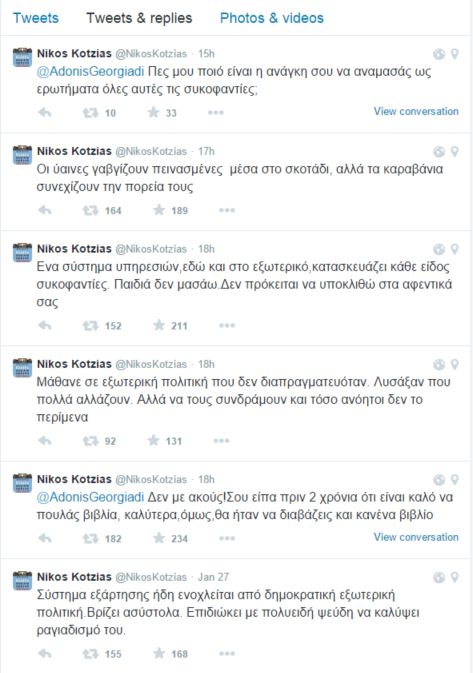 Μάχη δίνεται στα social media ανάμεσα στον Υπουργό Εξωτερικών Νίκο Κοτζιά και τον Άδωνι Γεωργιάδη, με αφορμή μια ανάρτηση του πρώτου του βράδυ της Τρίτης η οποία ανέφερε: «Σύστημα εξάρτησης ήδη ενοχλείται από δημοκρατική εξωτερική πολιτική. Βρίζει ασύστολα. Επιδιώκει με πολυειδή ψεύδη να καλύψει ραγιαδισμό του».