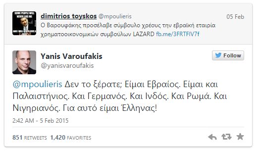 Πριν από λίγες ώρες, ο Υπουργός Οικονομικών Γιάνης Βαρουφάκης, έδωσε την παραπάνω, αποστομωτική απάντηση σε tweet χρήστη σχετικά με την πρόσληψη της "εβραϊκής", όπως την ονομάζει, εταιρίας χρηματοοικονομικών συμβούλων LAZARD.