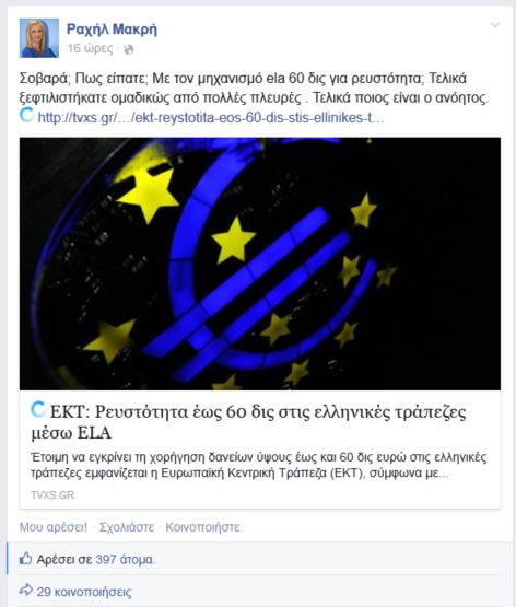 «Σοβαρά; Πως είπατε; Με τον μηχανισμό ela 60 δις για ρευστότητα; Τελικά ξεφτιλιστήκατε ομαδικώς από πολλές πλευρές. Τελικά ποιος είναι ο ανόητος» αναφέρει στην ανάρτησή της...