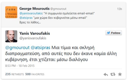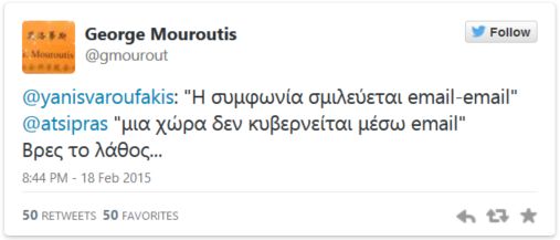 Αφορμή στάθηκε η δήλωση του Γιάννη Βαρουφάκη σε δημοσιογράφους ότι: «μέρα με τη μέρα, ώρα με την ώρα, email με email επιτυγχάνεται σύγκλιση απόψεων» με τους δανειστές.
