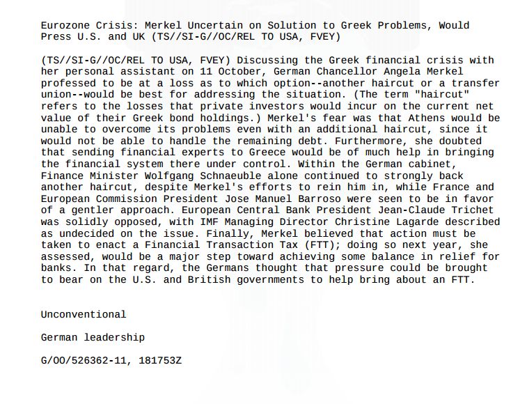 Η Υπηρεσία Εθνικής Ασφάλειας των ΗΠΑ (NSA) είχε καταγράψει συνομιλία της Μέρκελ με τον Γενικό Διευθυντή Ευρωπαϊκών Υποθέσεων Nicolaus Mayer-Landrut τον Οκτώβριο του 2011, λίγες ημέρες πριν από την απόφαση της Συνόδου Κορυφής για επιπρόσθετο κούρεμα των ομολόγων.