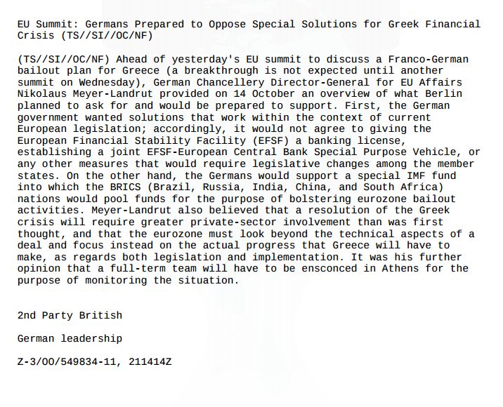 Intercepted communication by UK's Intelligence Services of German Chancellery Director-General for EU Affairs Nikolaus Meyer-Landrut reveals German negotiating positions ahead of a European Union Summit to discuss a joint German French response to the financial crisis in Greece. The report reveals that Germany had opposed tailored European solutions to the Greek crisis, instead supporting a special IMF bailout plan for Greece funded by the BRICS countries.