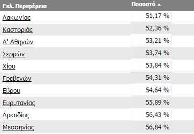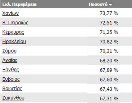 Οι δέκα πρώτες περιφέρειες είναι τα Χανιά, η Β Πειραιώς, η Κέρκυρα, το Ηράκλειο, η Σάμος, η Αχαϊα, η Ξάνθη, η Εύβοια, η Βοιωτία και η Ζάκυνθος
