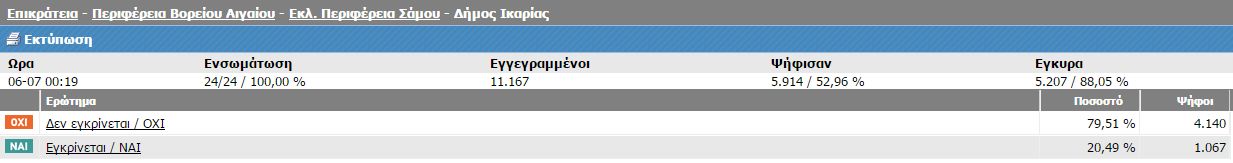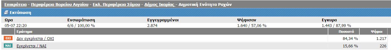 Οι Ράχες ξεπέρασαν και το ΟΧΙ στο σύνολο της Ικαρίας που έπιασε πολύ υψηλό νούμερο, έφτασε στο 79,51%.
