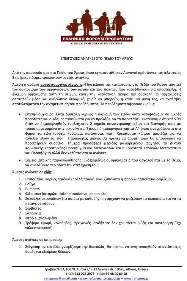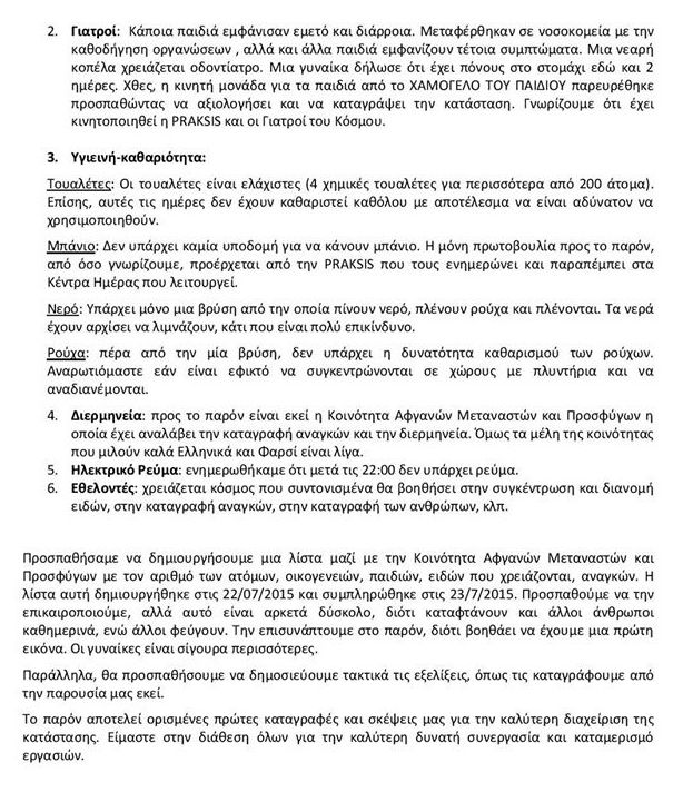 Στα συνημμένα οι γενικές ανάγκες, όπως έχουν καταγραφεί από το Ελληνικό Φόρουμ για τους Πρόσφυγες (http://www.refugees.gr/epikairotita/449-2015-07-27-13-32-57)