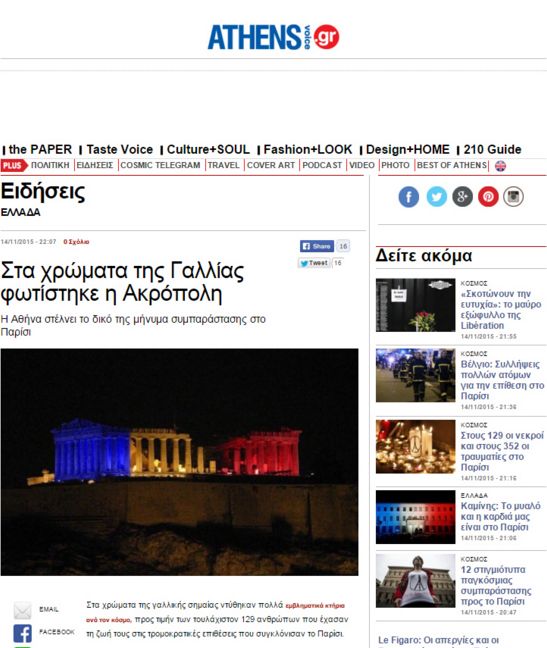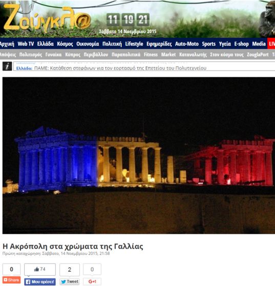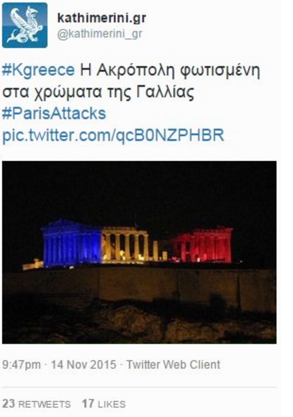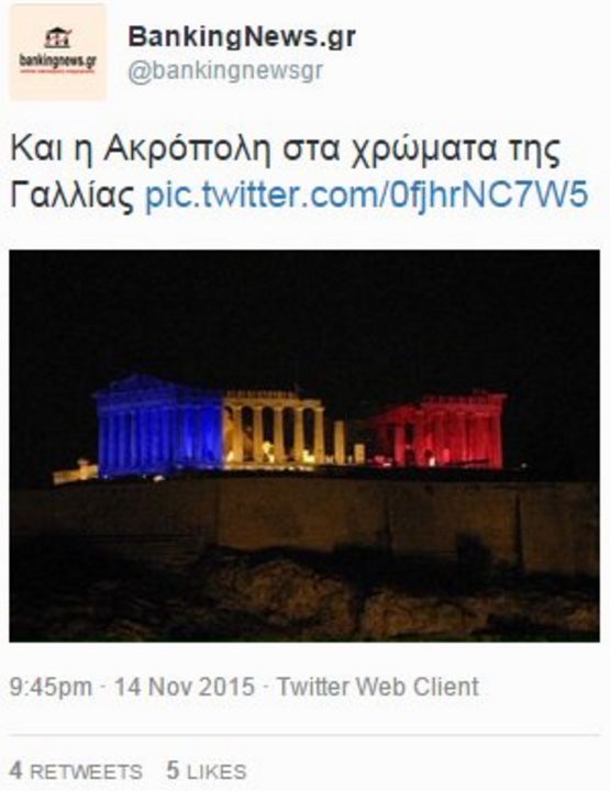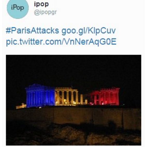 Ένας χρήστης του twitter το Σάββατο με την χρήση του photoshop "έβαψε" στα χρώματα της γαλλικής σημαίας τον Παρθενώνα.