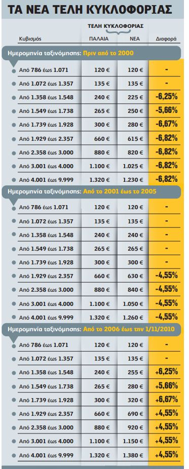 Ενδεικτικά, για αυτοκίνητα που ταξινομήθηκαν από τον Ιανουάριο του 2006 έως την 1η Νοεμβρίου του 2010 και είναι από 1.358 έως 1.548 κυβικά εκατοστά, τα τέλη κυκλοφορίας τους αυξάνονται από τα 240 στα 255 ευρώ.