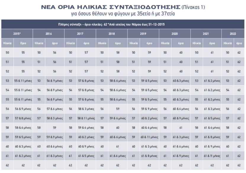 Σε κάθε άλλη περίπτωση που η σύνταξη καταβάλλεται ανεξαρτήτως ορίου ηλικίας (για όσους έχουν διορισθεί στο Δημόσιο από 1-1-1983 και μετά και συμπληρώνουν 37 χρόνια υπηρεσίας) η σταδιακή αύξηση (Πίνακας 1) αρχίζει από 19-8-2015 με όριο ηλικίας το 55ο έτος.