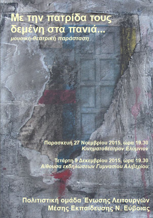 μετά την πολύ επιτυχημένη παράσταση στη Λίμνη Ευβοίας, η Πολιτιστική Ομάδα της ΕΛΜΕ Εύβοιας συνεχίζει την περιοδεία της, με το έργο "Με την πατρίδα τους δεμένη στα πανιά",