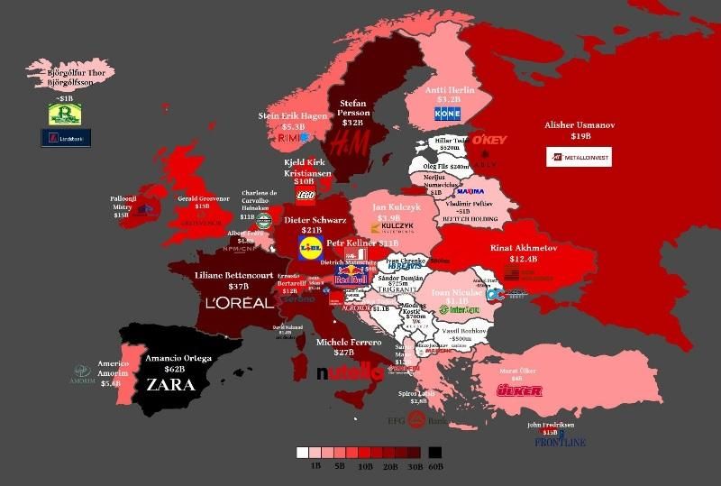 Η βρετανική Independent που πριν λίγες μέρες δημοσίευσε το τελευταίο της φύλλο δημοσίευσε έναν χάρτη που αποτυπώνει τους πλουσιότερους Επιχειρηματίες ανά της χώρες της Ευρώπης.