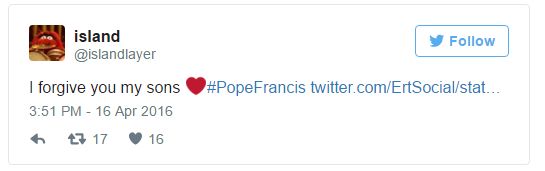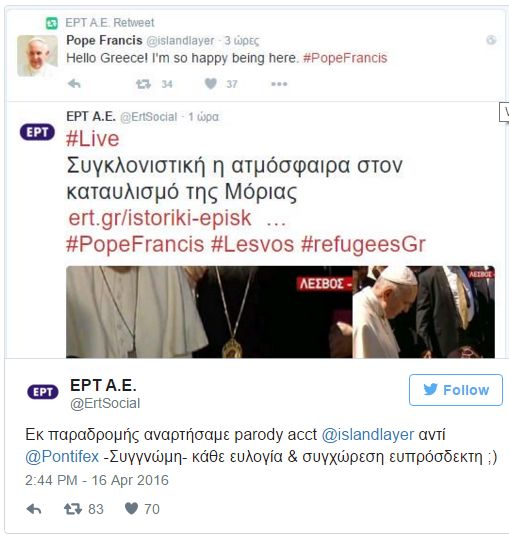 Ο λογαριασμός-τρολλ όμως του Πάπα απάντησε στο σχόλιο της ΕΡΤ λέγοντας πως τους συγχωρεί για το λάθος τους!