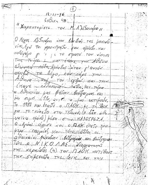 Το θέμα της έκθεσης ήταν "Χαρακτηρίστε τον Μέγα Αλέξανδρο" και ο μαθητής Δημοτικού, που τώρα είναι γύρω στα 30, έδωσε τη δική του εκδοχή για τον Μακεδόνα Βασιλιά.