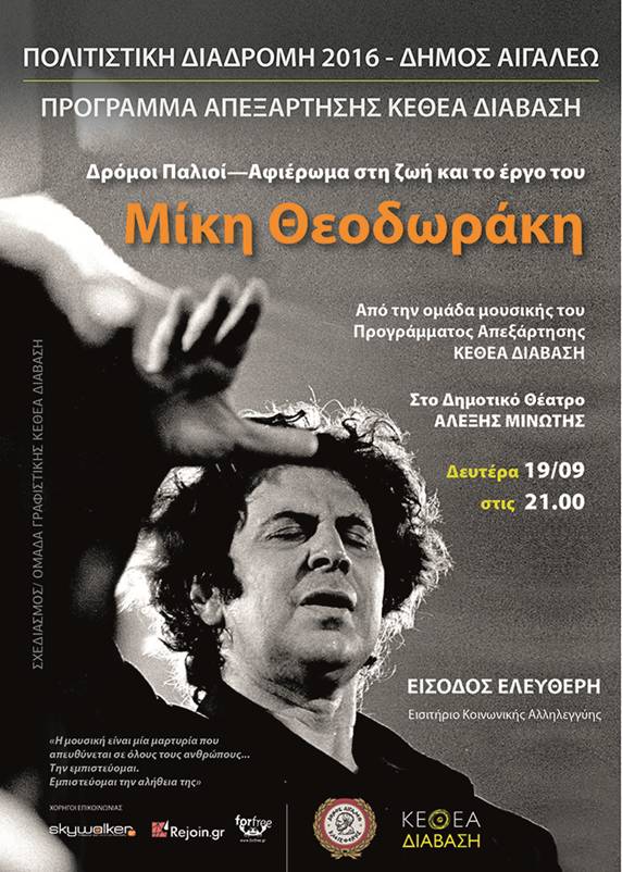 Αναζητώντας την αλήθεια της μουσικής μέσα από καθαρά μονοπάτια, η ομάδα μουσικής του Πολιτιστικού Στεκιού ΚΕΘΕΑ ΔΙΑΒΑΣΗ ετοίμασε ένα αφιέρωμα στο έργο και τη ζωή του μεγάλου Έλληνα συνθέτη ερμηνεύοντας τραγούδια του και παρουσιάζοντας αυτοβιογραφικά κείμενά του. Ένα αφιέρωμα σε έναν καλλιτέχνη που με το έργο του δίδαξε αγώνα θυμίζοντάς μας πάντα ότι κάτω από οποιεσδήποτε συνθήκες μπορούμε να σκεφτόμαστε ελεύθερα και να ελπίζουμε.