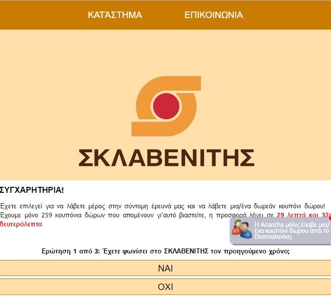 Πρόκειται για ανάρτηση με την περιγραφή "έρευνα αγοράς". Με την απάντηση τριών ερωτήσεων η "έρευνα" υπόσχεται δωροεπιταγές των super market Σκλαβενίτης.
