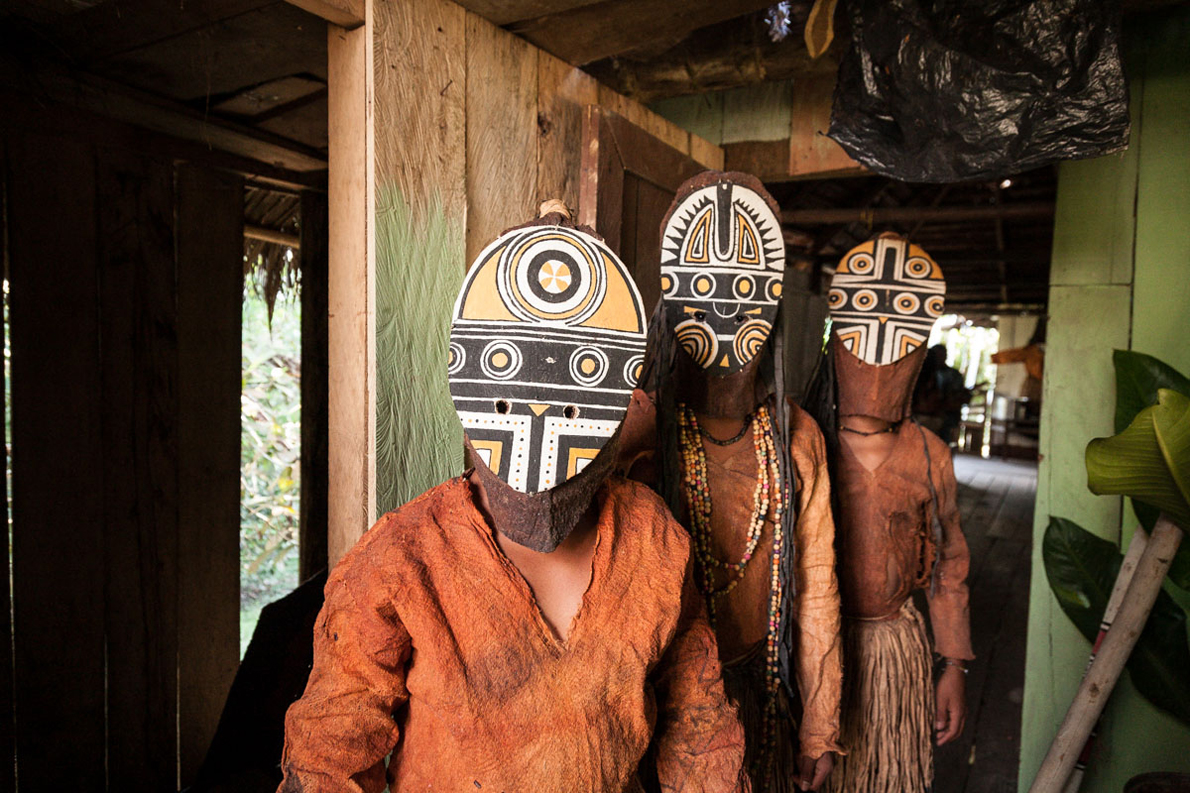 Οι τρεις νεαροί Μακεδόνες είναι έτοιμοι να χορέψουν. Προσέξτε την υπέροχη διακόσμηση που έχουν οι μάσκες τους ‒τα μοτίβα τους παραπέμπουν σε εκείνα της ελληνικής αρχαϊκής περιόδου. Είναι ζωγραφισμένες με χρώματα φτιαγμένα από τα φυτά της ζούγκλας.