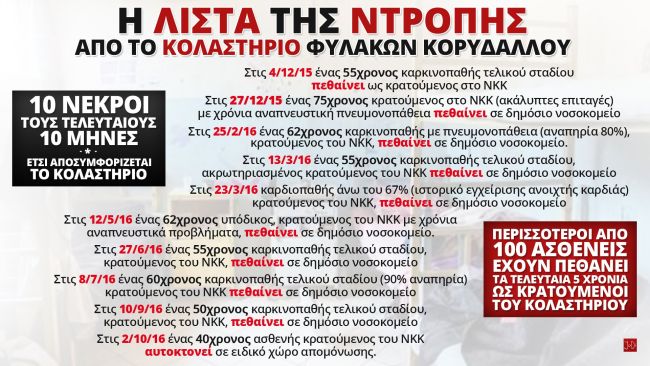 Οι καταγγελίες αναφέρουν ότι το νοσοκομείο κρατουμένων μόνο νοσοκομείο δεν είναι και ο ένας θάνατος διαδέχεται τον άλλον, ενώ το Νοσοκομείο των Φυλακών δεν εποπτεύεται από το υπουργείο Υγείας και δεν ανήκει καν στο ΕΣΥ.