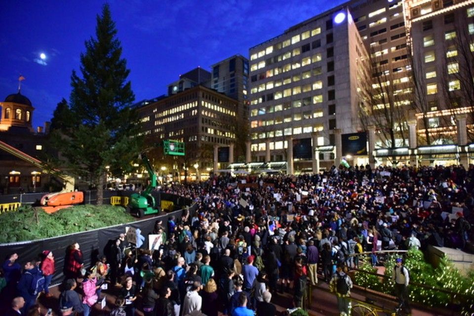Portland's anti-Trump protest turns to chaos as anarchists smash cars and bus stop. Photos by @chrisonstott. https://t.co/4U5XGixqL6 pic.twitter.com/po6oIbIOIQ