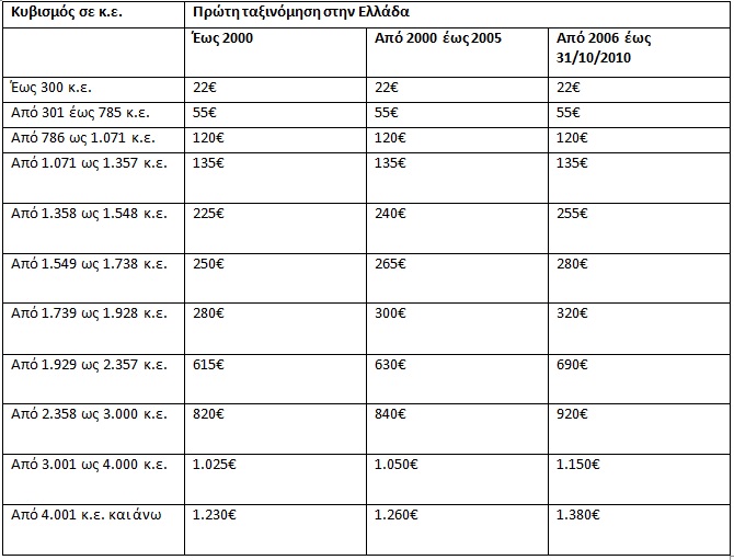 Για επιβατηγά αυτοκίνητα, δίκυκλες και τρίκυκλες μοτοσικλέτες που έχουν ταξινομηθεί έως 31/10/2010, ο υπολογισμός των τελών κυκλοφορίας γίνεται αποκλειστικά βάσει του κυβισμού τους.