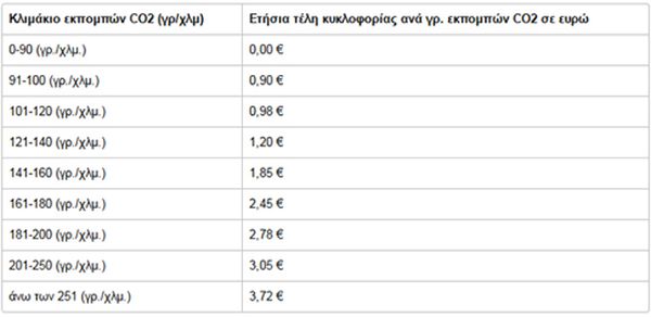 Για όσα αυτοκίνητα και μοτοσυκλέτες ταξινομήθηκαν από την 1η Νοεμβρίου 2010 και μετά, τα τέλη υπολογίζονται βάσει της εκπομπής ρύπων.