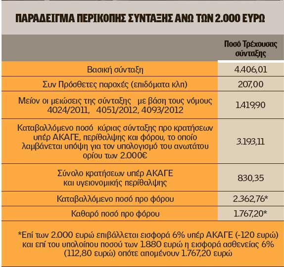 • Το ανώτατο μηνιαίο όριο ατομικής σύνταξης μέχρι τις 31/12/2018 δεν μπορεί να υπερβαίνει το ποσό των 2.000 ευρώ. Ως καταβαλλόμενο ποσό ατομικής μηνιαίας κύριας σύνταξης λαμβάνεται υπόψη το ακαθάριστο ποσό, η τυχόν συγκαταβαλλόμενη με αυτή προσωπική διαφορά καθώς και τα τυχόν συγκαταβαλλόμενα με τη σύνταξη επιδόματα (εξομάλυνσης, τέκνων, συζύγου αναπηρίας κλπ), αφαιρουμένων των μνημονιακών μειώσεων. Στο ποσό των 2.000 ευρώ, που προκύπτει, θα υπολογίζεται η κράτηση της Εισφοράς Αλληλεγγύης Συνταξιούχων υπέρ ΑΚΑΓΕ ενώ ηκράτηση για υγειονομική περίθαλψη θα υπολογίζεται επί του εναπομείναντος ποσού, μετά την αφαίρεση της κράτησης για Εισφορά Αλληλεγγύης Συνταξιούχων υπέρ ΑΚΑΓΕ. Σ καμία περίπτωση, βέβαια, το νέο καταβαλλόμενο προ φόρου ποσό της σύνταξης δεν θα μπορεί να υπερβαίνει το αντίστοιχο ποσό που καταβαλλόταν πριν...