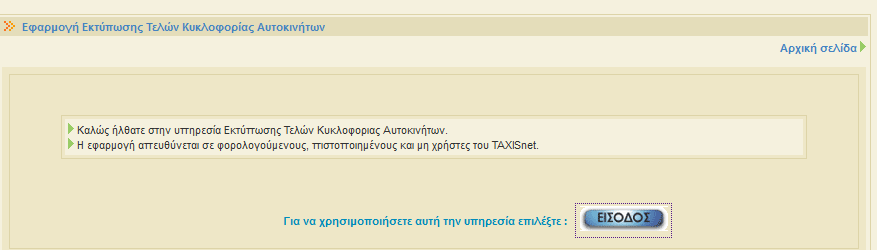 Για την είσοδο στην εφαρμογή εκτύπωσης του ειδοποιητηρίου πληρωμής των τελών κυκλοφορίας ο υπόχρεος πρέπει να μπει σε αυτή την ηλεκτρονική διεύθυνση και στη συνέχεια να κάνει "κλικ" στο πεδίο «ΕΙΣΟΔΟΣ». Στη συνέχεια θα μεταφερθεί στην ηλεκτρονική φόρμα όπου θα πρέπει να αναγράψει τον ΑΦΜ του και τον αριθμό κυκλοφορίας του οχήματός του και να κάνει κλικ στο πεδίο «Αναζήτηση». Αναρτήθηκαν στο www.gsis.gr τα τέλη κυκλοφορίας 2017. Για να δείτε, αλλά και να τυπώσετε, τα τέλη κυκλοφορίας 2017 θα πρέπει να μπείτε ΕΔΩ. ΠΡΟΣΟΧΗ: Το έτος πρέπει να αναγράφει “2017”. Για να μπείτε στην φόρμα πρέπει να πατήσετε στην ένδειξη “είσοδος”.