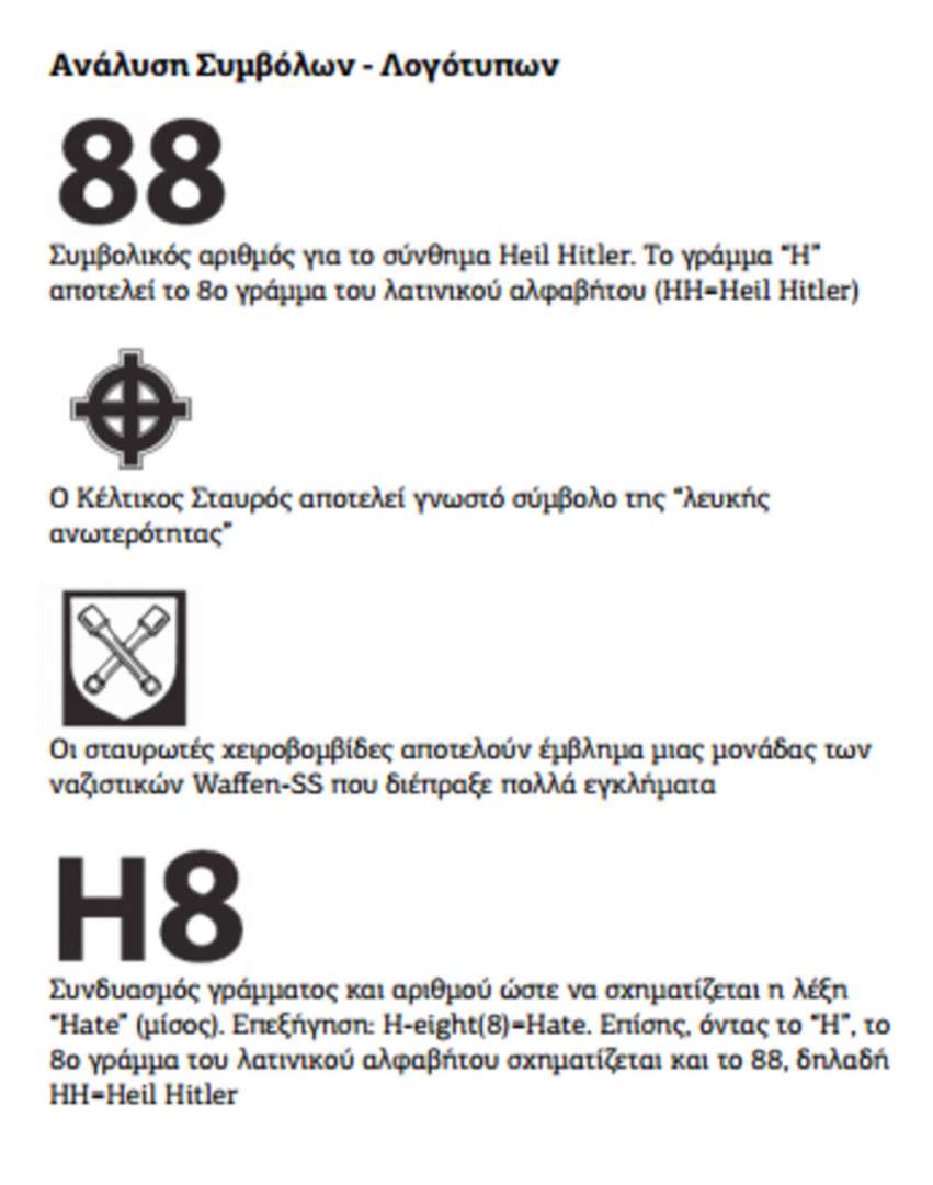 Στον οδηγό… τσέπης παρουσιάζονται τα λογότυπα ακροδεξιών οργανώσεων, όπως Ομάδα Ε-ΕΥ, Ανένταχτοι Μαίανδροι Εθνικιστές-ΑΜΕ, B&H-Blood & Honour-Αίμα και Τιμή, C18-Combat 18, HSN (Hammerskins Nation Organisation).