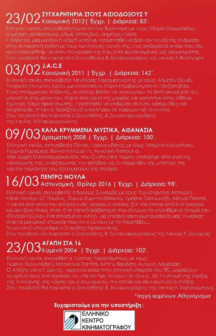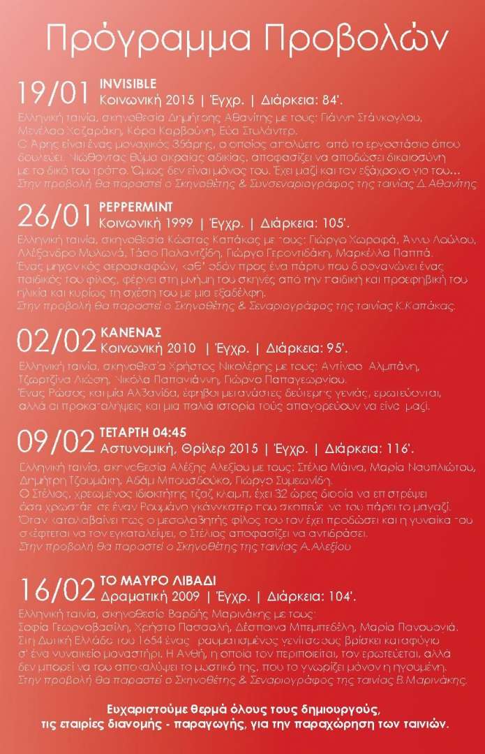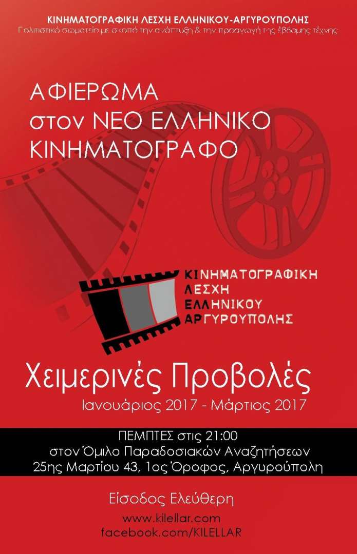 Χειμερινές προβολές, Ιανουάριος 2017 - Μάρτιος 2017, κάθε Πέμπτη στις 21:00, στον Όμιλο Παραδοσιακών Αναζητήσεων 25ης Μαρτίου 43, 1ος όροφος, Αργυρούπολη