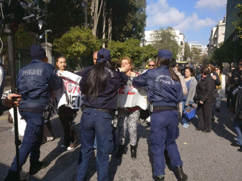 Σε πρώτη φάση γυναίκες αξιωματική στην περιοχή του Μεγάρου Μαξίμου επιχείρησαν να σταματήσουν τις καθαρίστριες χωρίς αποτέλεσμα και σειρά πήραν τα ΜΑΤ.