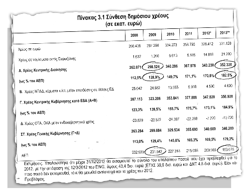 Το 2013 με το ΑΕΠ να προϋπολογίζεται στα 193 δισ. ευρώ, το Χρέος της Κεντρικής Διοίκησης υπολογίζεται να εκτιναχθεί στο 182,5% του ΑΕΠ της χώρας!