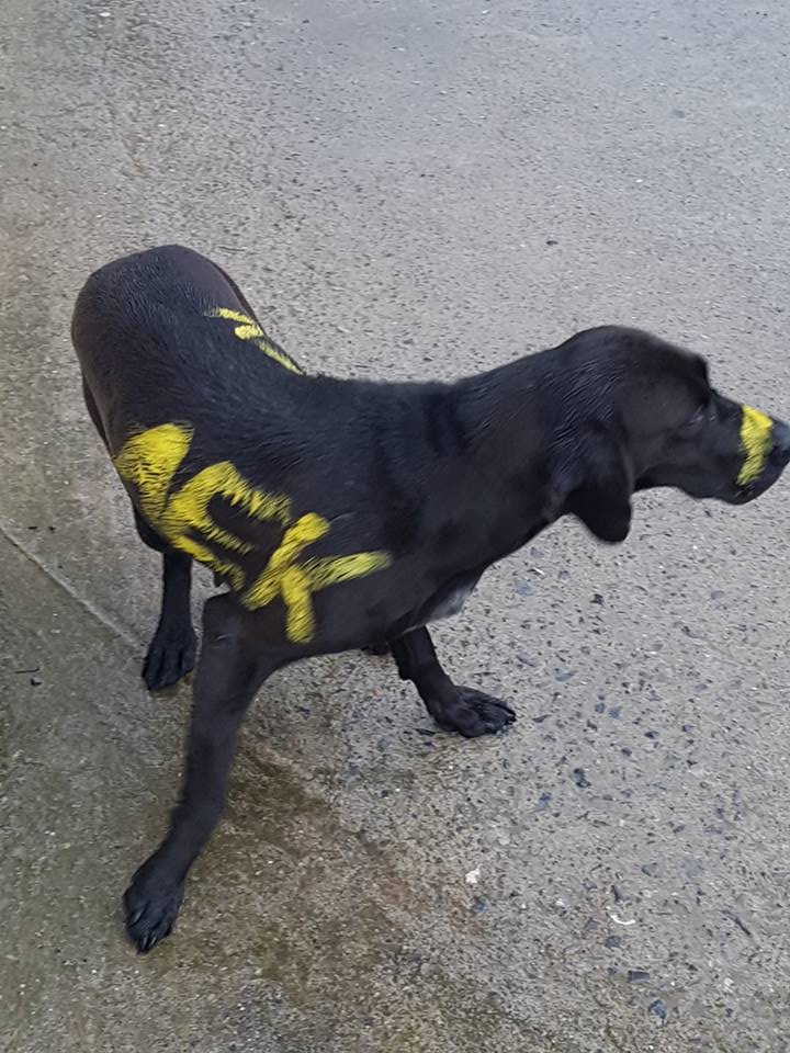 Σύμφωνα με το zoosos.gr, στο facebook δημοσιεύτηκαν σήμερα μερικές φωτογραφίες ενός μαύρου σκύλου που κάποιος στην Μεγαλόπολη Αρκαδίας έβαψε με κίτρινο χρώμα και το όνομα "ΑΕΚ".