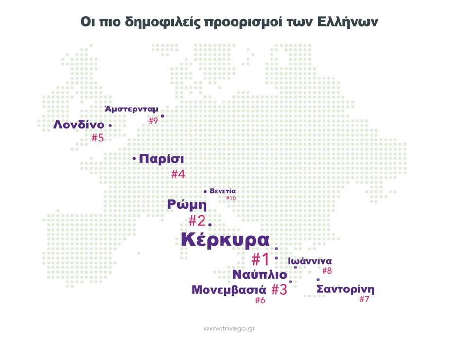 Ειδικότερα, υποσκελίστηκε μετά από τρία χρόνια από την πρώτη θέση των προτιμήσεων των Ελλήνων ταξιδιωτών η Ρώμη, παραχωρώντας τη θέση της στην Κέρκυρα. Αυτό αντανακλά τη γενικότερη τάση επιστροφής των Ελλήνων σε εγχώριους προορισμούς. Χαρακτηριστικά, ενώ πέρυσι οι οκτώ από τους δέκα προορισμούς ήταν διεθνείς, φέτος ο αριθμός αυτός μειώθηκε στους πέντε.