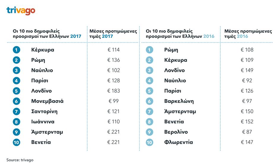Αυξήθηκαν χαρακτηριστικά οι μέσες προτιμώμενες τιμές σε πολλούς προορισμούς σε σχέση με τις αντίστοιχες του 2016. Η μεγαλύτερη αύξηση παρατηρήθηκε στη Ρώμη, όπου φέτος η μέση προτιμώμενη τιμή αυξήθηκε κατά 26% σε σχέση με την περσινή των 108 ευρώ και διαμορφώθηκε στα 136 ευρώ.
