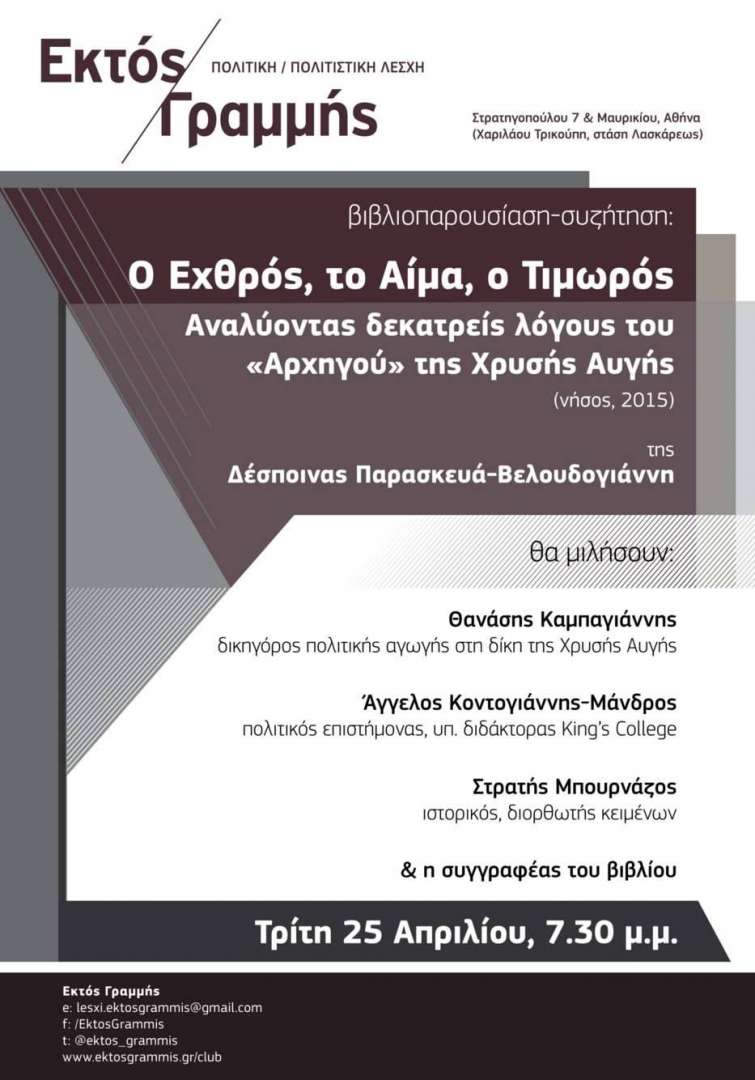 Παρουσίαση και συζήτηση πάνω στο βιβλίο "Ο Εχθρός, το Αίμα, ο Τιμωρός – Αναλύοντας δεκατρείς λόγους του «Αρχηγού» της Χρυσής Αυγής", της Δέσποινας Παρασκευά-Βελουδογιάννη, θα διεξαχθεί στην πολιτική-πολιτιστική Λέσχη Εκτός Γραμμής (Αθήνα, Στρατηγοπούλου 7 & Μαυρικίου) την Τρίτη 25 Απριλίου, 7:30 μ.μ.
