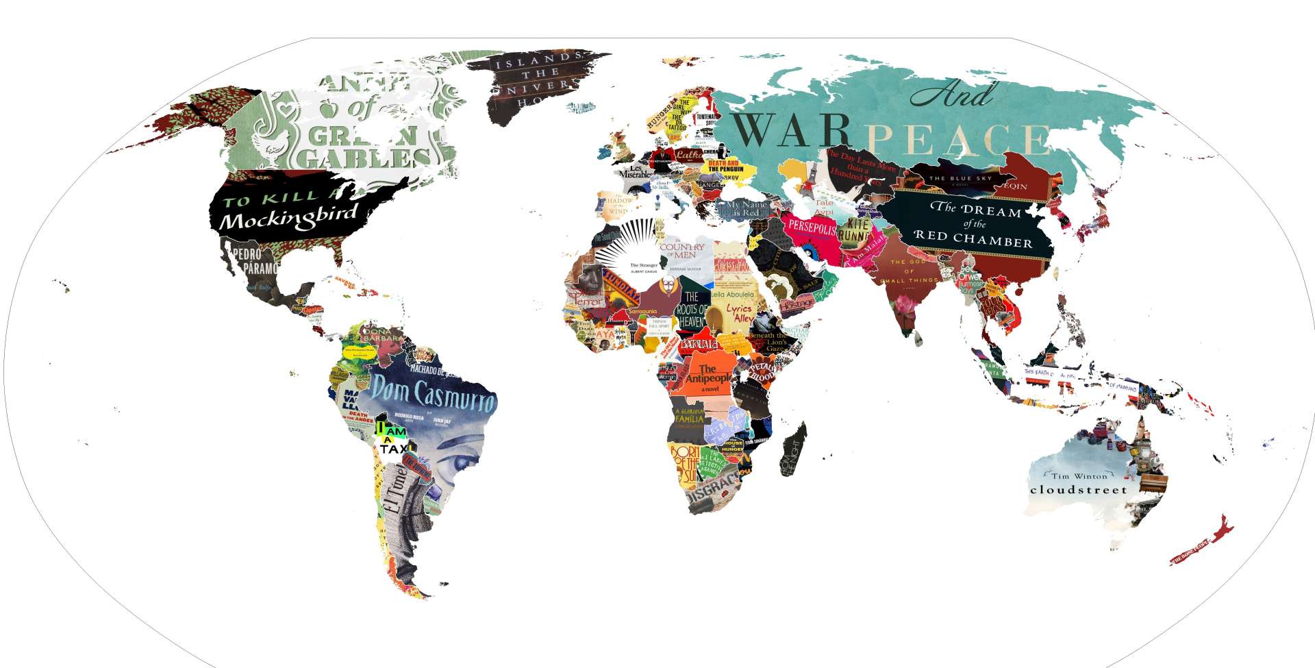 Η πρωτότυπη αυτή δημιουργία του χρήστη Backforward24, που έγινε viral, περιλαμβάνει κυρίως κλασικά έργα που έχουν ταυτιστεί με κάθε χώρα, αλλά και σύγχρονα μυθιστορήματα που προκάλεσαν αίσθηση.