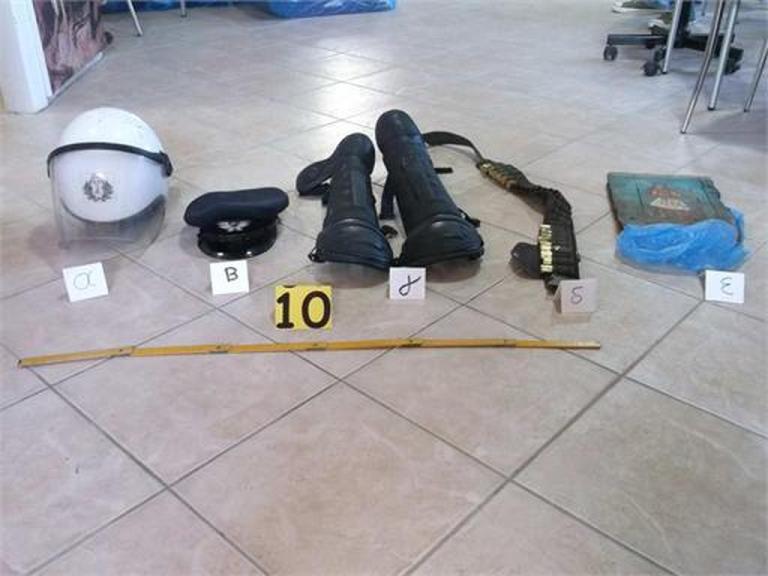 Κάποια από τα ευρήματα της ΕΛΑΣ: επικαλαμίδες, κράνη, καπέλα, φυσίγγια.