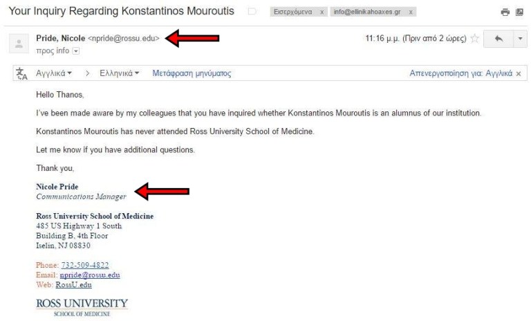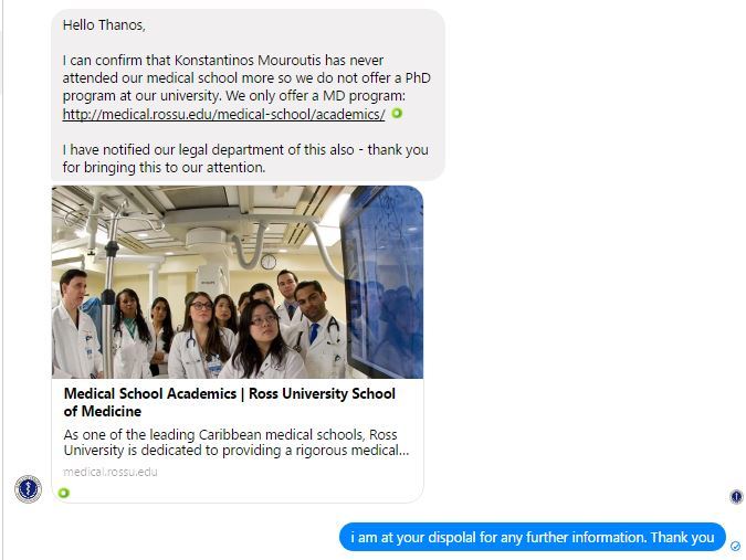 Το Ross University μας επιβεβαιώσε, αρχικά μέσω facebook και στη συνέχεια με email, πως «… ο Κωνσταντίνος Μουρούτης δεν έχει φοιτήσει στην ιατρική σχολή μας και επιπλέον, δεν απονέμουμε διδακτορικούς τίτλους, αλλά μόνο MD (Bachelor). Ενημερώσαμε σχετικά το νομικό μας τμήμα – ευχαριστούμε για την ενημέρωση«.
