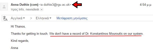 Η απάντηση μας ήρθε σε λίγες ώρες από τη κα Anna Duthie, υπεύθυνη επικοινωνίας του Robert Gordon University και ήταν σύντομη και περιεκτική: «Δεν υπάρχει στο σύστημά μας οποιοδήποτε αρχείο για τον Δρ. Κων/νο Μουρούτη«.