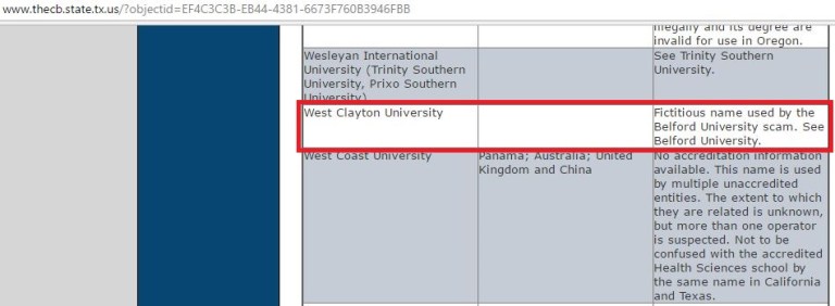 Το West Clayton University είναι ένα ακόμη πανεπιστήμιο, από το οποίο ο ίδιος ο κος Μουρούτης ισχυρίζεται (στο δεύτερο βίντεο) πως έχει πτυχίο. Σύμφωνα με την έρευνα μας και όπως μπορεί να διαπιστώσει ο καθένας από μια πρόχειρη έρευνα στη Google, πρόκειται για ένα πανεπιστήμιο «μαϊμού» που έδρασε στις ΗΠΑ μέχρι το 2012, με τους εγκεφάλους της κομπίνας να έχουν έδρα στα Ηνωμένα Αραβικά Εμιράτα και στο Πακιστάν. Ήταν αλλιώς γνωστό και ως Belford University και σύμφωνα με το Texas Higher Education Coordinating Board (πολιτειακή υπηρεσία που επιβλέπει τη 3βάθμια εκπαίδευση στο Τέξας), πρόκειται για ανύπαρκτο «πανεπιστήμιο», όπως φαίνεται στη παρακάτω εικόνα, το οποίο, πληρώνοντας το κατάλληλο αντίτιμο, χορηγεί πλαστά πτυχία στον οποιονδήποτε.