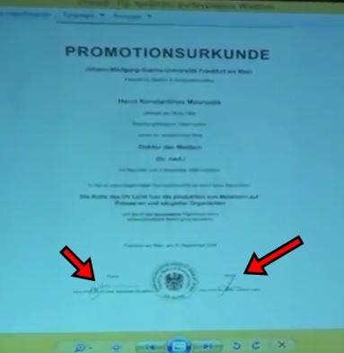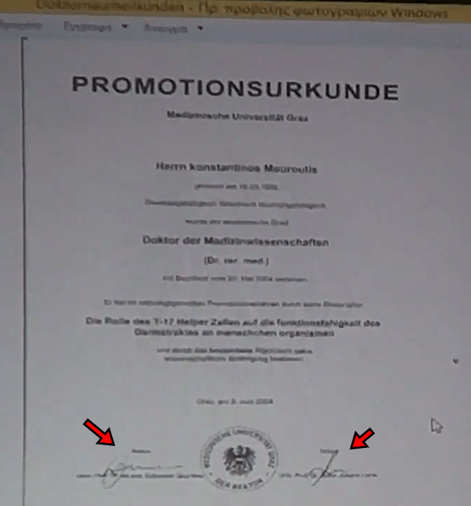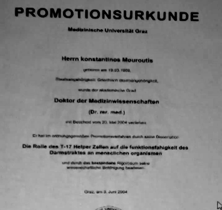 Στο πρώτο βίντεο, τη θέση του διδακτορικού από το Ross University, παίρνει διδακτορικό από το Πανεπιστήμιο του Graz.