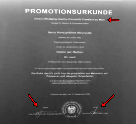 Στο πρώτο βίντεο που παραθέσαμε στην αρχή, ο κος Μουρούτης παρουσιάζει μέσω προβολικού δύο διδακτορικούς τίτλους που ισχυρίζεται πως κατέχει, ένα από Αυστρία και ένα από Γερμανία (προσέξτε τις υπογραφές).