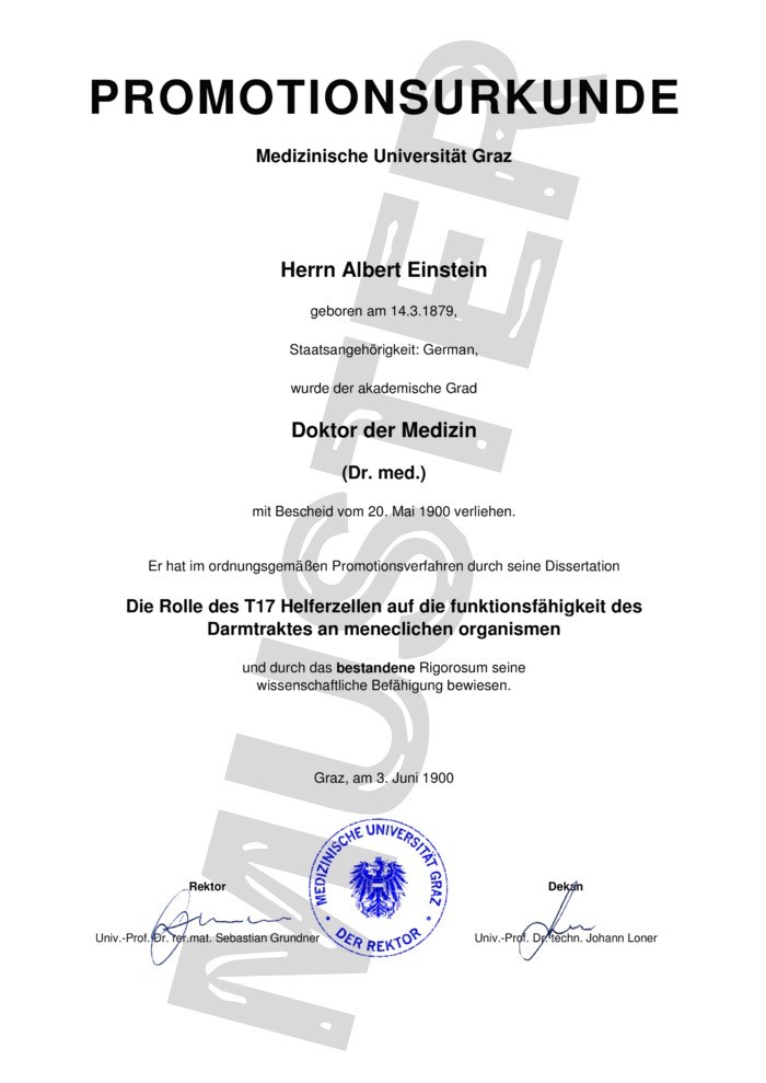 Έτσι φτιάξαμε και εμείς ένα διδακτορικό ιατρικής από το Πανεπιστήμιο του Graz, σαν αυτό του κου Μουρούτη και το αφιερώνουμε… στη μνήμη του Άλμπερτ Αϊνστάιν που δεν υπήρξε ποτέ γιατρός. Προσέξτε τις υπογραφές:
